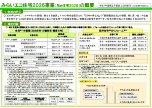 2050年カーボンニュートラルの実現に向けて住宅の省エネ化の支援を強化するため、国土交通省、環境省及び経済産業省の連携による「住宅省エネ2026キャンペーン」の実施を通じて、「GX志向型住宅の新築」、「子育て世帯等を対象とする長期優良住宅・ZEH水準住宅の新築」、「住宅の省エネリフォーム等」を支援します。